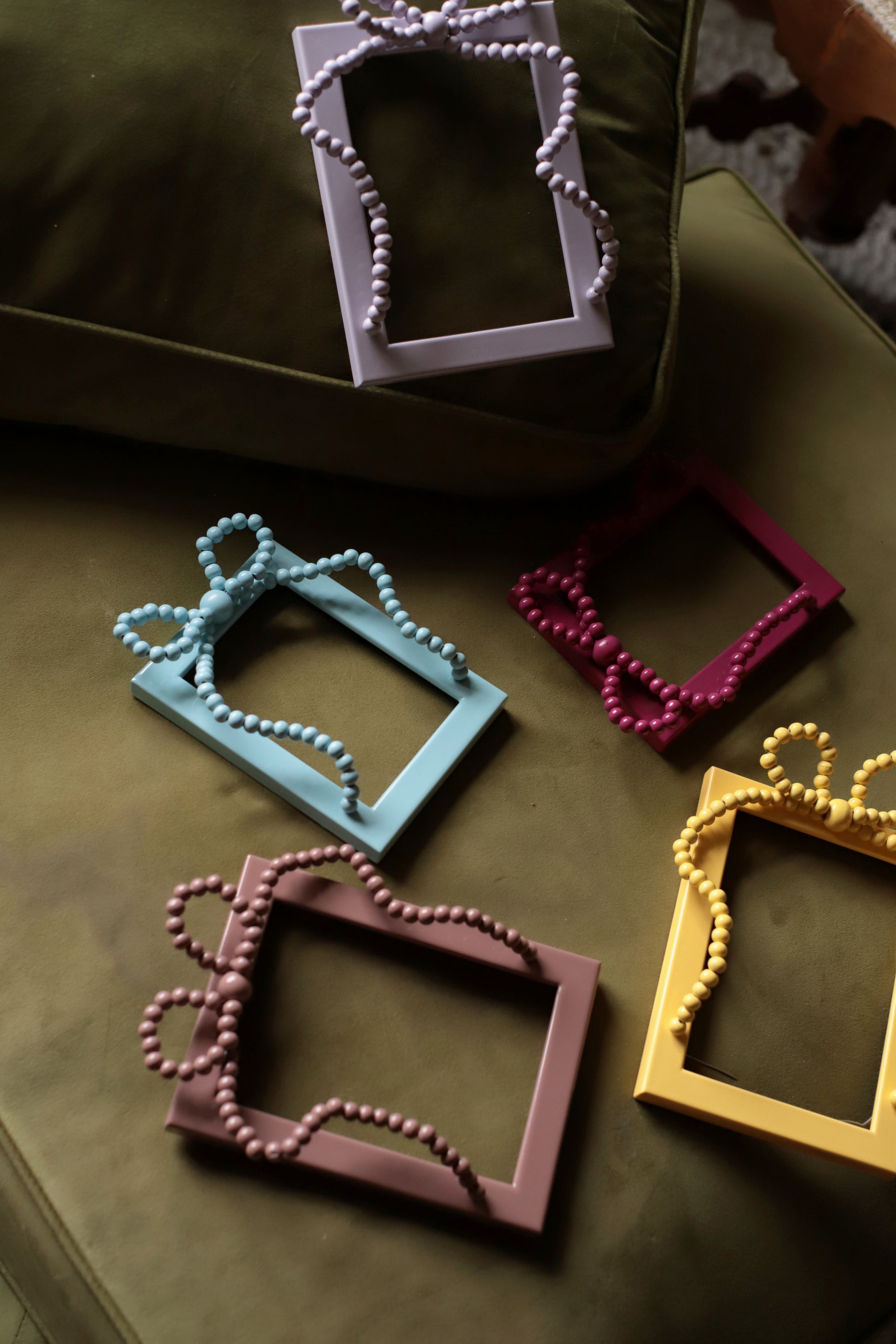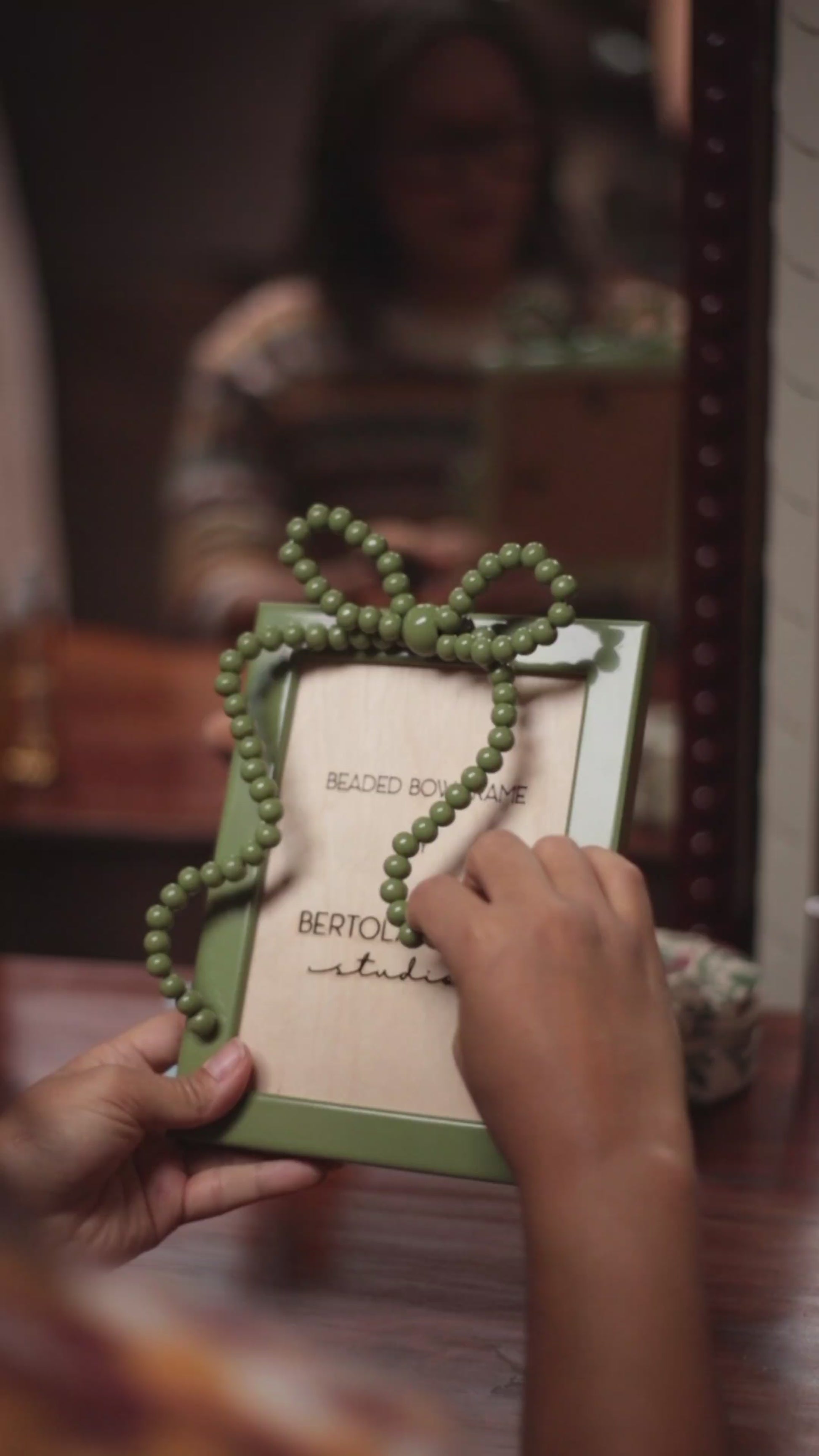 Each Beaded Bow Frame is a handcrafted work of art constructed from solid wood and adorned with an intricate beaded bow. Finished in layers of high-gloss lacquer for a deep, luminous sheen and completed with real glass glazing, this frame brings a touch of sculptural sophistication to any interior.